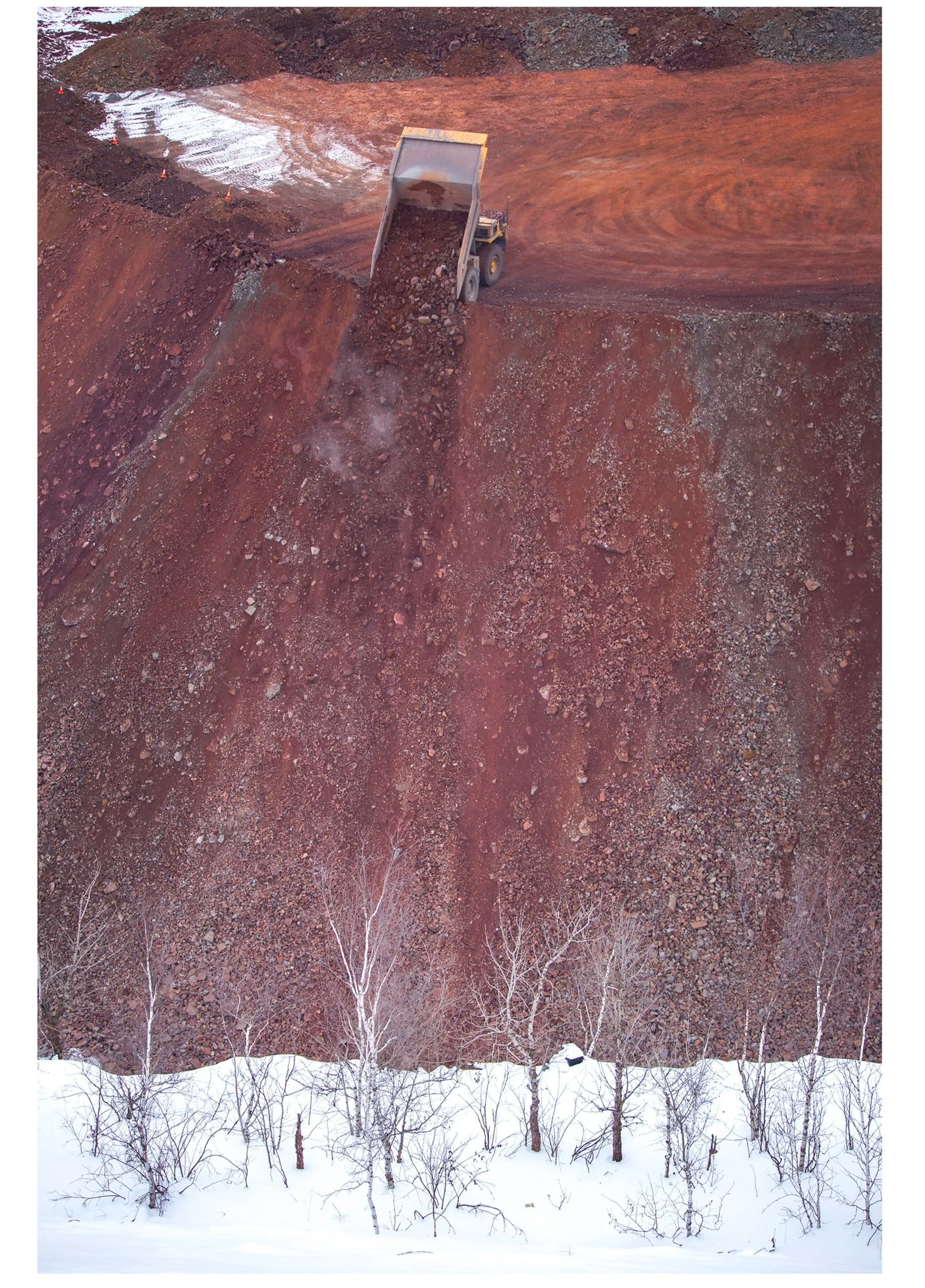 In a region of the country not associated with dramatic topography, the man-made canyons of the Iron Range have come to define this corner of northern Minnesota. It is a landscape that it is constantly changing due to both the booms and busts of an entire industry. We most obviously associate these pits with active mining, yet they also transform once mining stops. After the high-grade ore was depleted in the post-WWII years, many pits were allowed to fill with water. With no natural outlet, this produced pit lake is several hundred feet deep. At one point, the water seen here in the bottom of the Hull-Rust pit reached the base of the vertical cliff in the upper left corner of the photo. Once Hibbing Taconite has depleted the remaining ore body, pumping will stop, and the water level will rise once again.